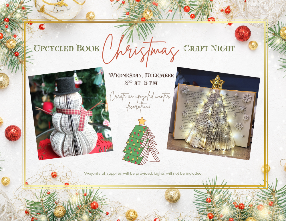 Booked for Crafting: Upcycled Book Christmas Craft Night Date: Wednesday, December 3, 2025 Time: 6:00 PM – 7:00 PM Location: Rawlins Library Join us for a festive evening of creativity! Create an upcycled winter decoration using old books and craft materials.