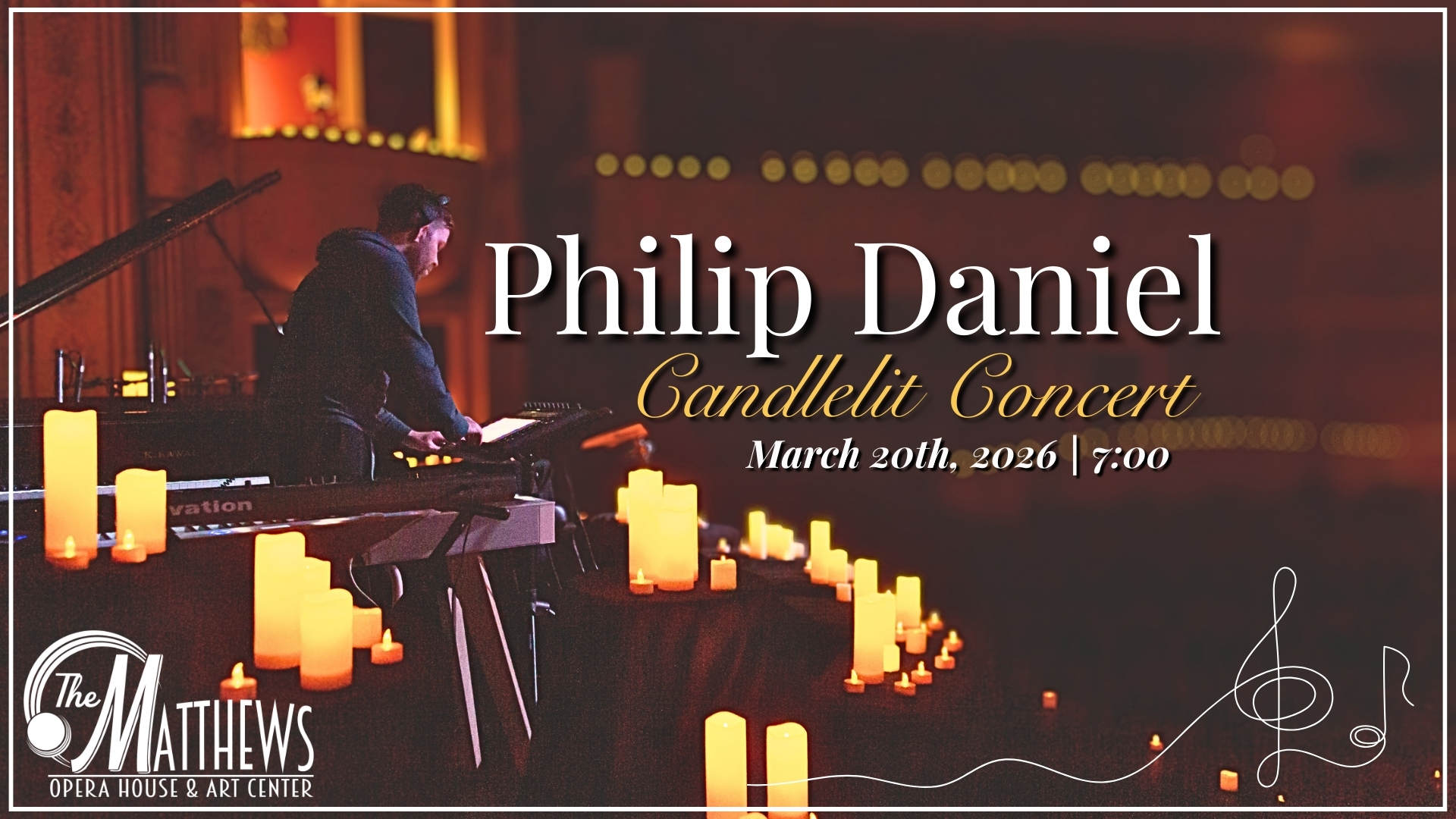 The Matthews (Opera House & Arts Center) North Main Street, Spearfish, SD, United StatesJoin us for a mesmerizing CANDLELIT performance by Philip Daniel, a celebrated pianist and composer from Lincoln, Nebraska. Known for his unique blend of classical, minimalist, and cinematic music, Philip incorporates live-looping, synths, and percussion to create an immersive auditory journey. This intimate evening will feature two captivating 45-minute sets, showcasing Philip’s signature style that [...]